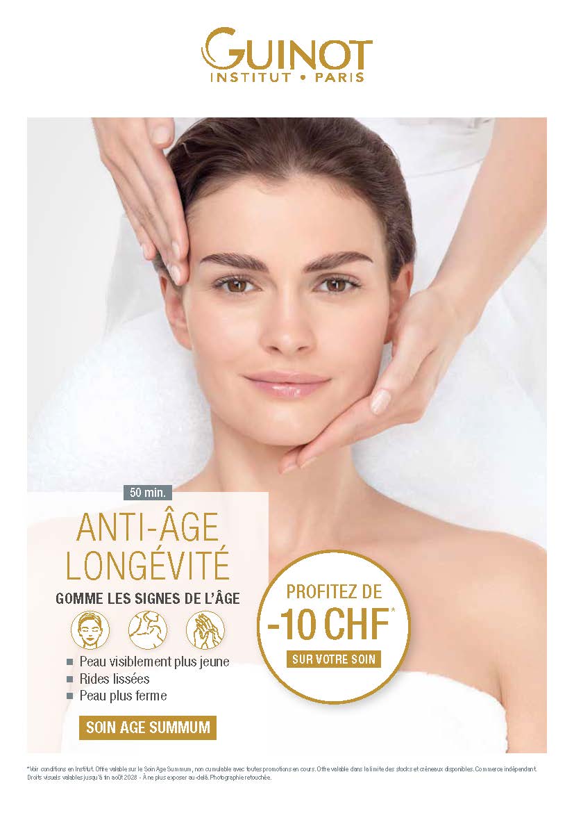 Tout au long du mois de janvier, l’Institut Guinot Lausanne vous propose une offre spéciale : –10 CHF sur le soin anti-âge AGE SUMMUM. Age Summum est un soin visage ...